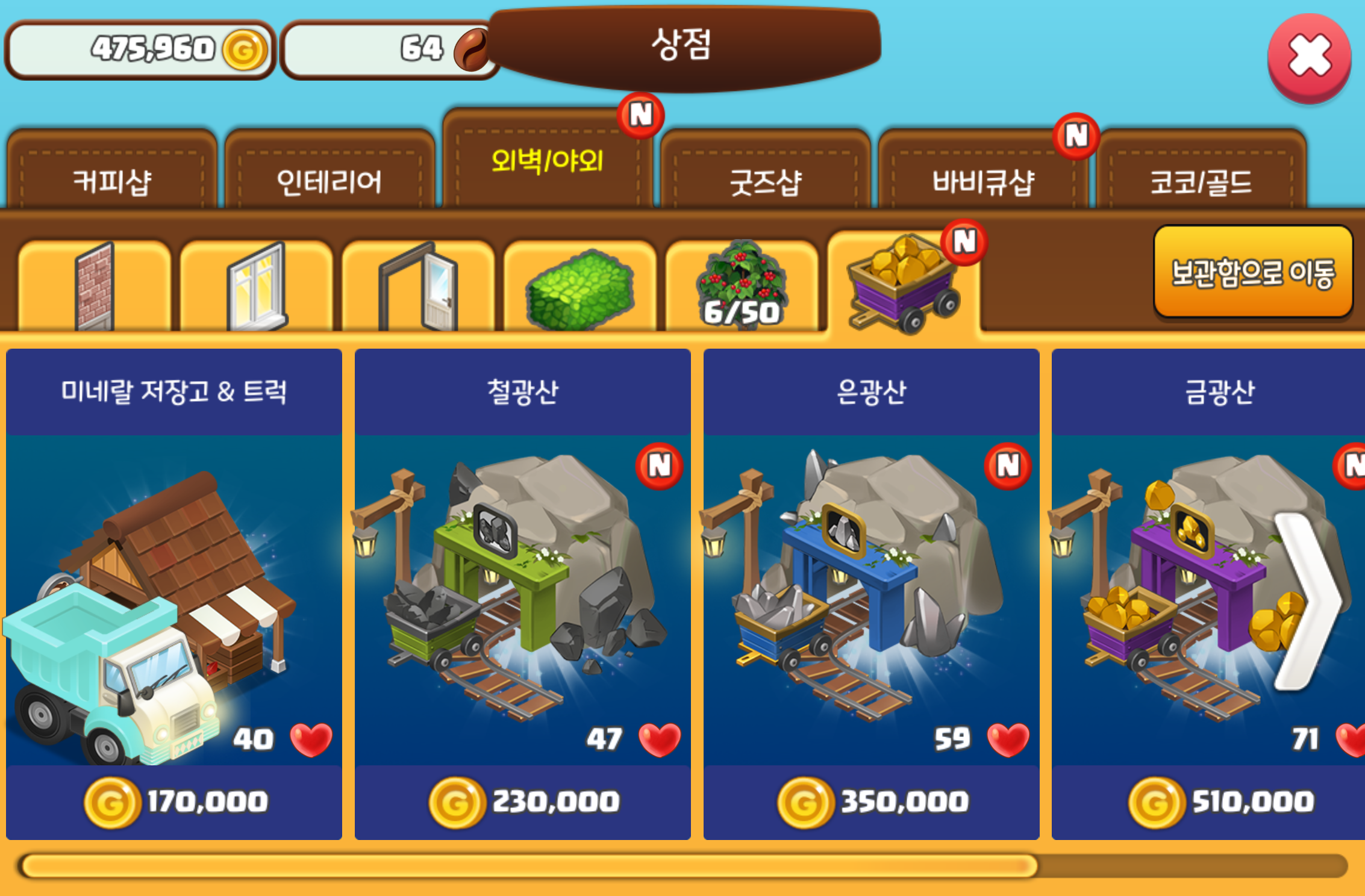 상점 > 외벽/야외 > 골드 카트 아이콘을 눌러 미네랄 저장고와 광산을 설치하세요.