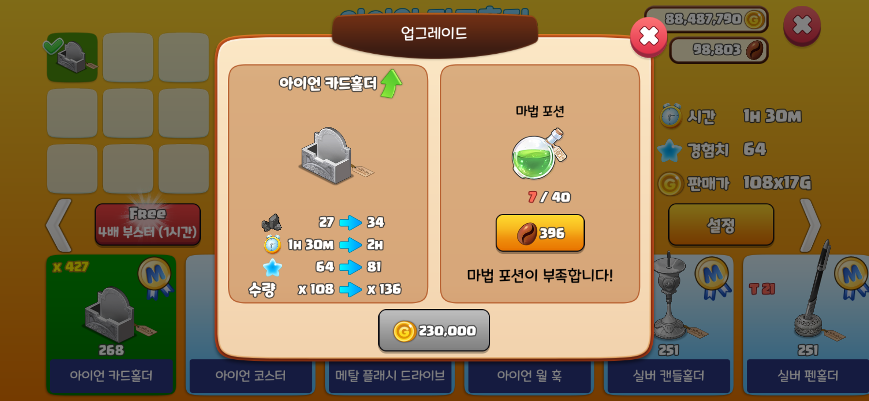 아이템(요리) 저장고 용량 확대
