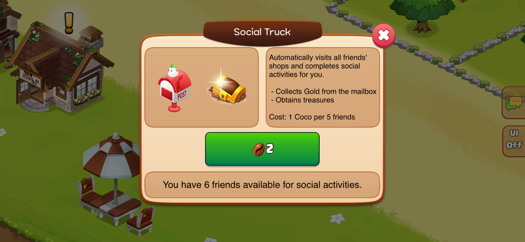 The Social Truck automatically visits all your friends’ shops and completes social activities.