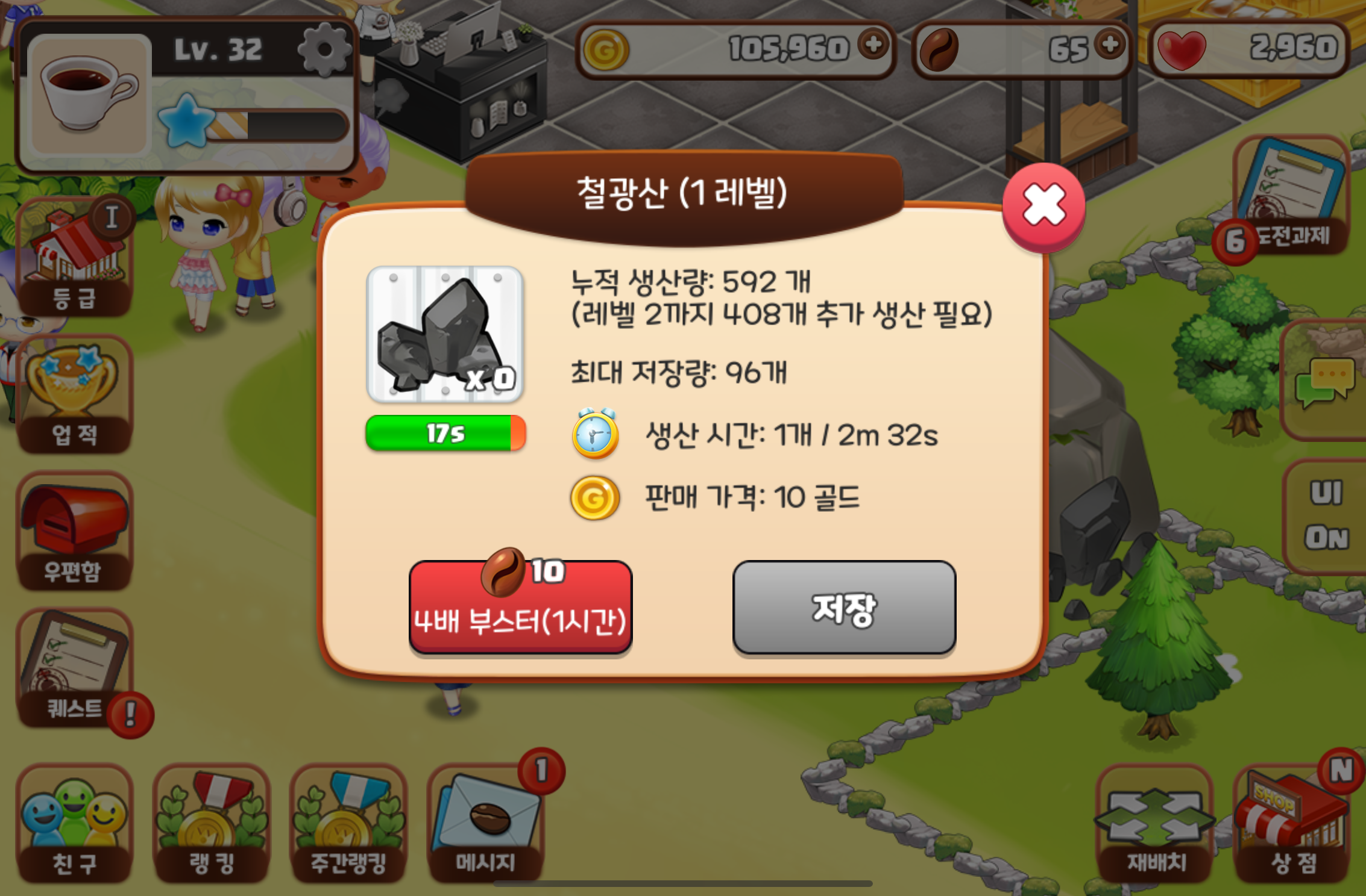일정량의 광물을 저장고에 보관하면 광산을 레벨업할 수 있습니다.