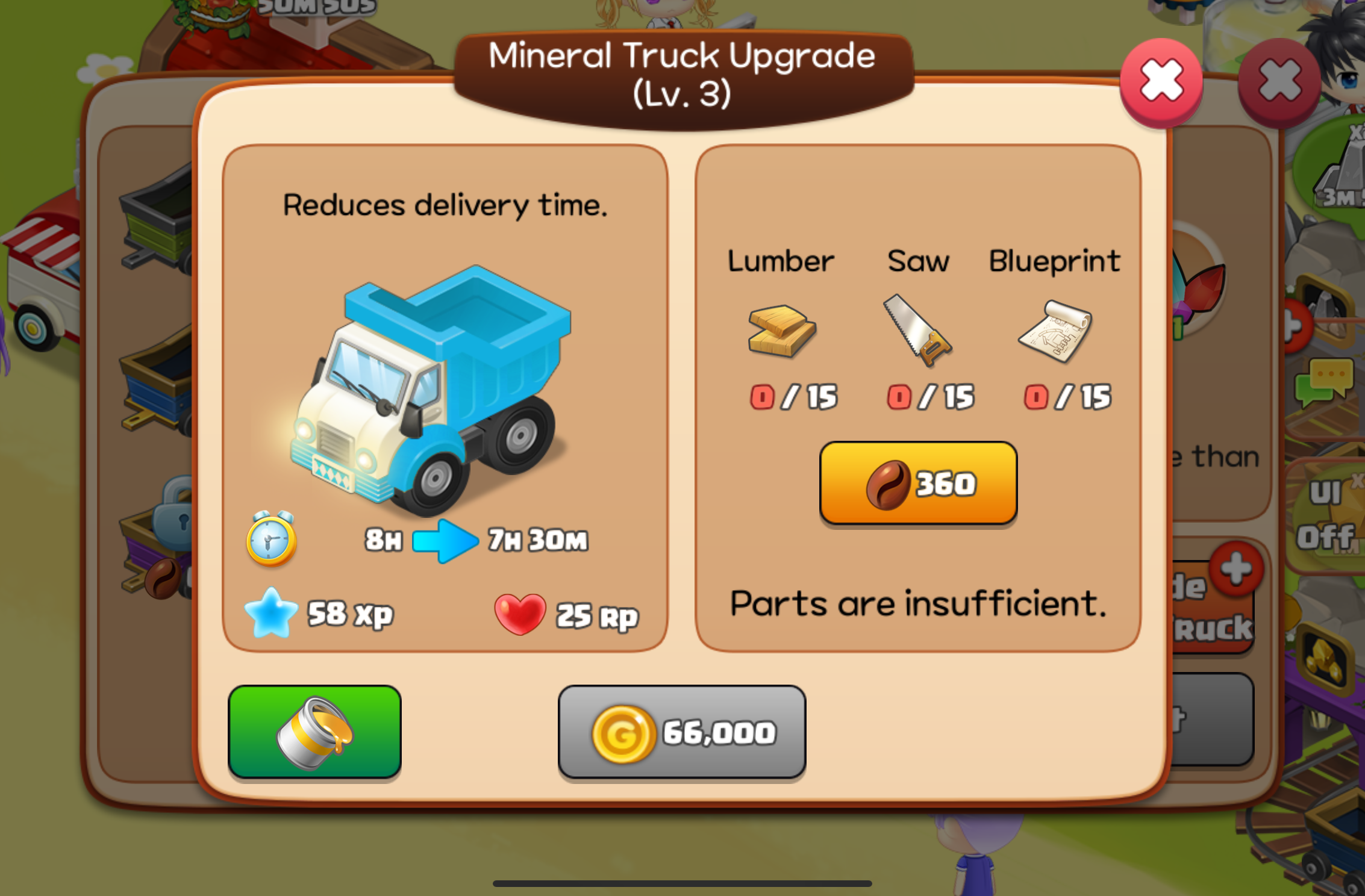 In the loading popup, press “Upgrade Mineral Truck” and spend Parts and Gold to upgrade.