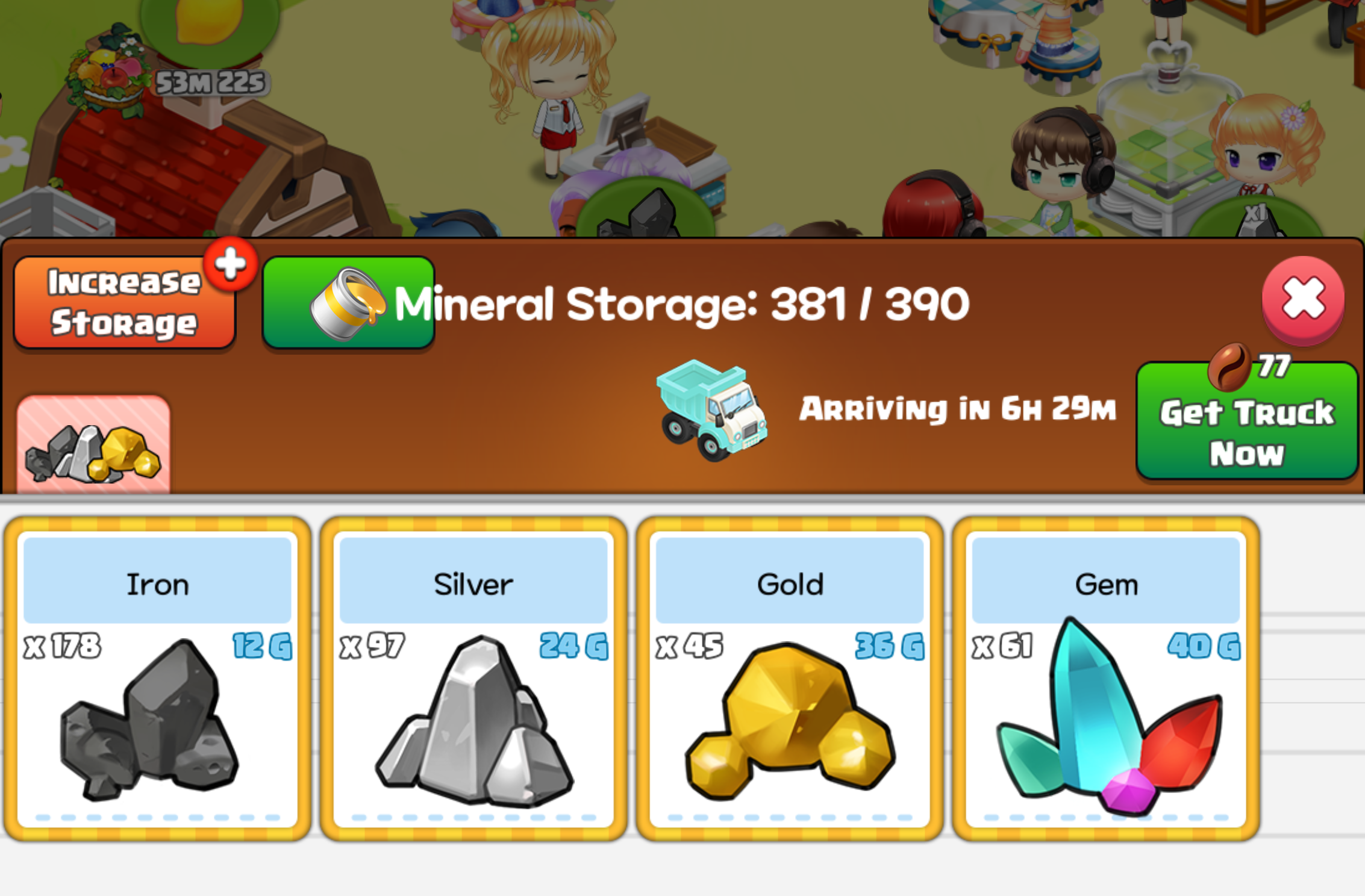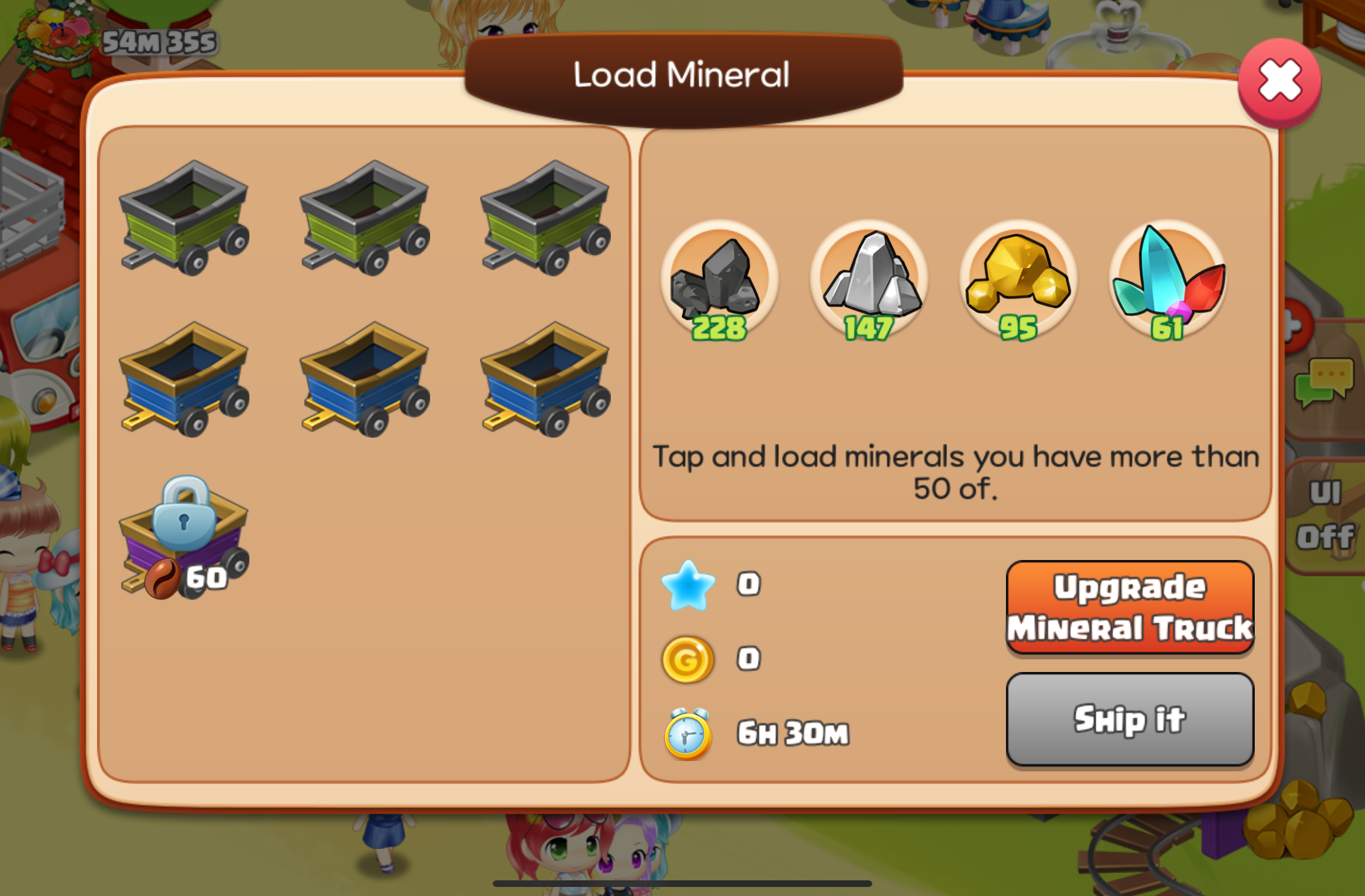 Tap the truck to open the loading popup. Minerals with at least 50 units can be loaded.
